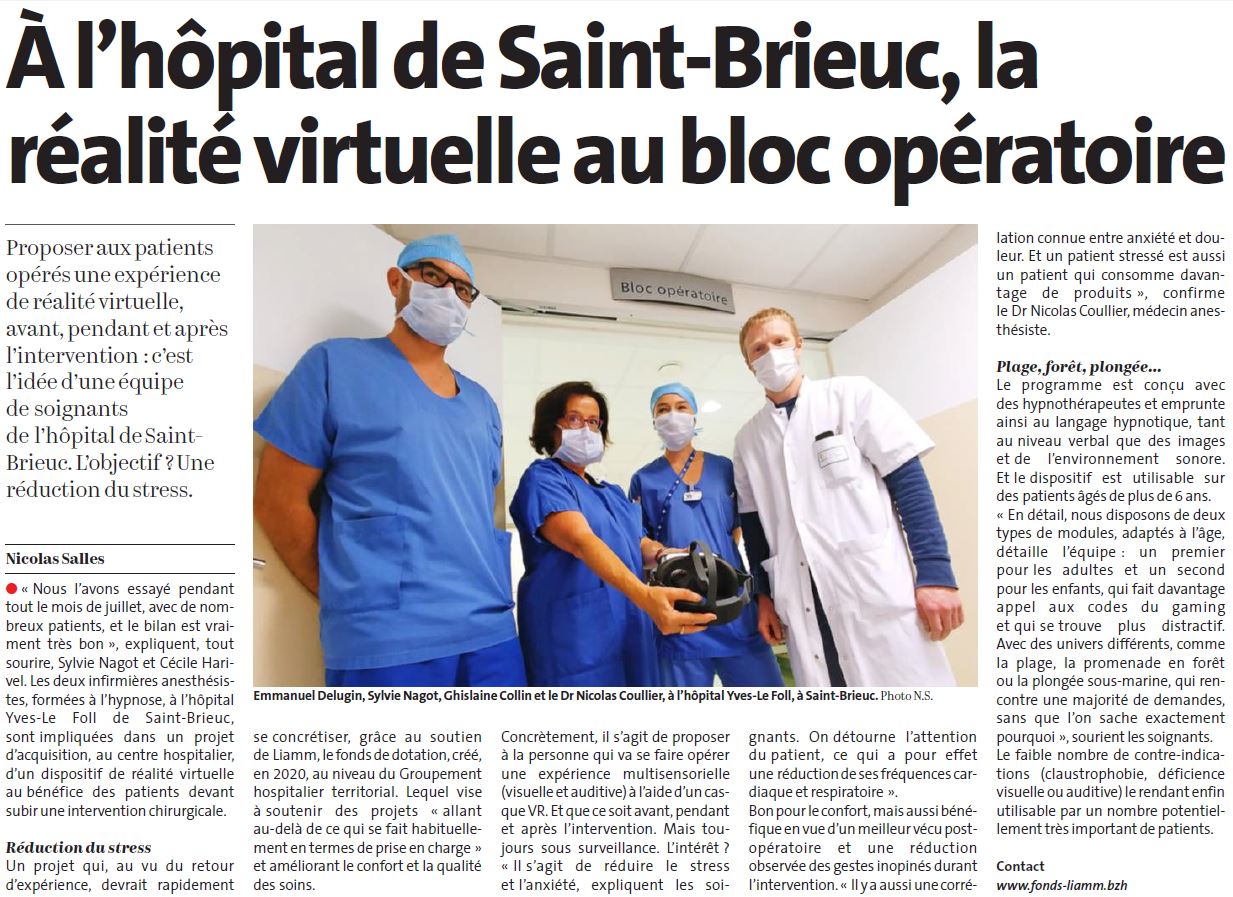 L’objectif de ce projet vise à réduire le stress et l’anxiété des patients opérés, en leur proposant une expérience de réalité virtuelle avant, pendant et après l’opération. L’acquisition du dispositif de réalité virtuelle, concrètement un casque, améliorera le confort, le vécu post-opératoire mais limitera également les gestes inopinés possibles durant l’intervention.