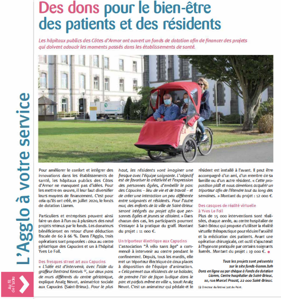 Les hôpitaux publics des Côtes d’Armor ont créé le fonds de dotation Liamm afin de financer des projets permettant de développer l’innovation et la recherche, ainsi que l’amélioration du confort des patients dans les établissements de santé.