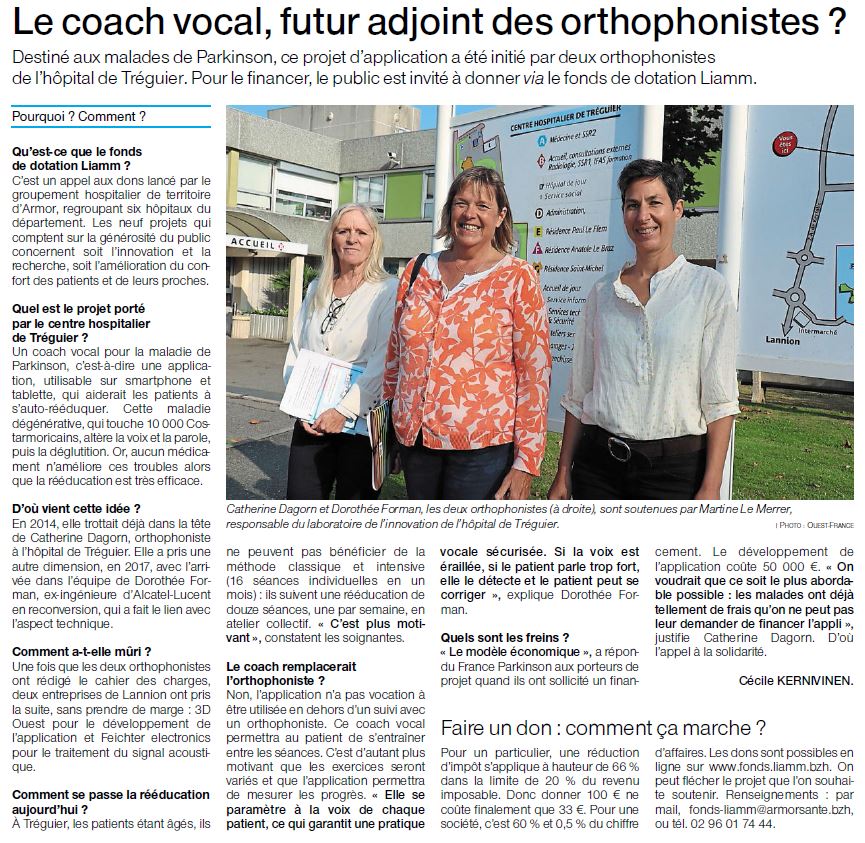 Porté par le Centre Hospitalier de Tréguier, le projet « Un coach vocal pour la maladie de Parkinson » a pour finalité de mettre à disposition une application, utilisable donc sur smartphone et tablettes, de rééducation. Cette application sera intégrée au parcours de suivi avec l’orthophoniste en permettant au patient de s’entraîner entre 2 séances.