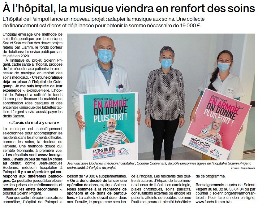 Porté par le Centre Hospitalier de Paimpol, le projet Son et Soin consiste à proposer aux patients des morceaux de musique en renfort des soins médicaux.